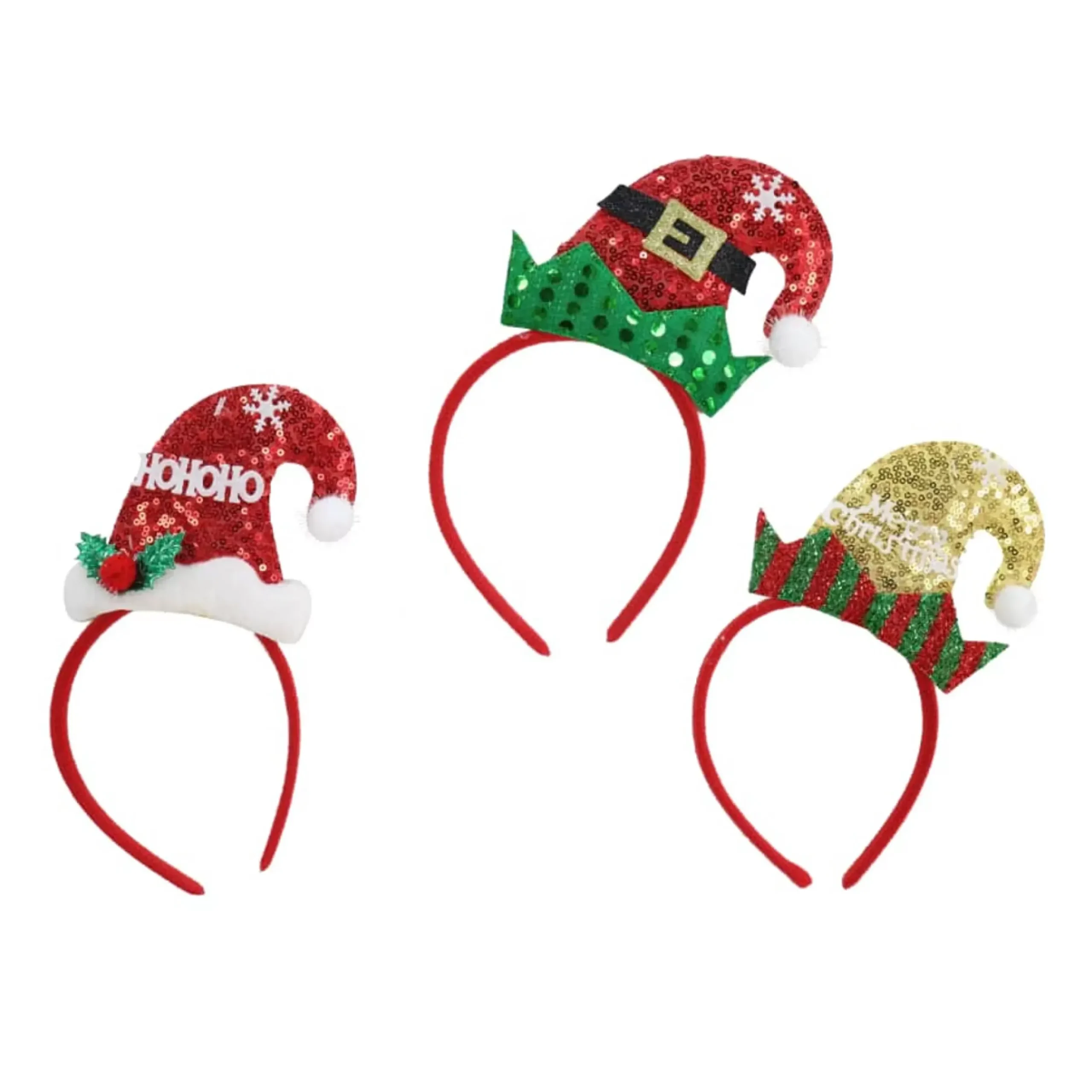 Styles: Red Headband Sequin Ho Ho Ho Hat , Gold Headband Sequin Hat , Red Headband Sequin Belt Hat