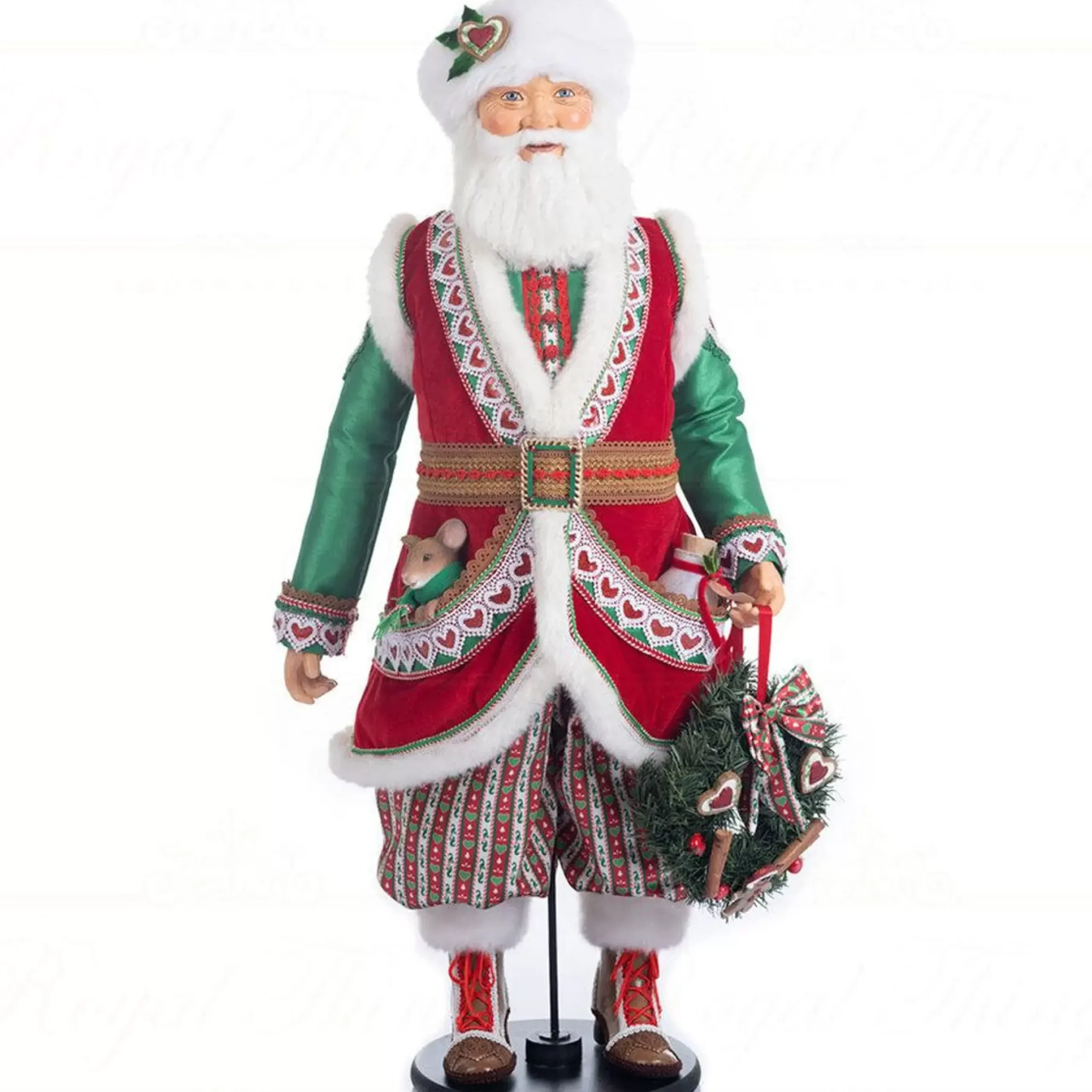 Dress Up Your Home For The Holidays With The Seasoned Greetings Papa Nicolas Nutmeg Doll And Celebrate Classic Christmas Customs. This Artistic Santa Doll Comes In A Festive Palette Of Red, Green And White Trims. He Holds A Wreath With A Beautiful Bow, Gingerbreads And Love Hearts.