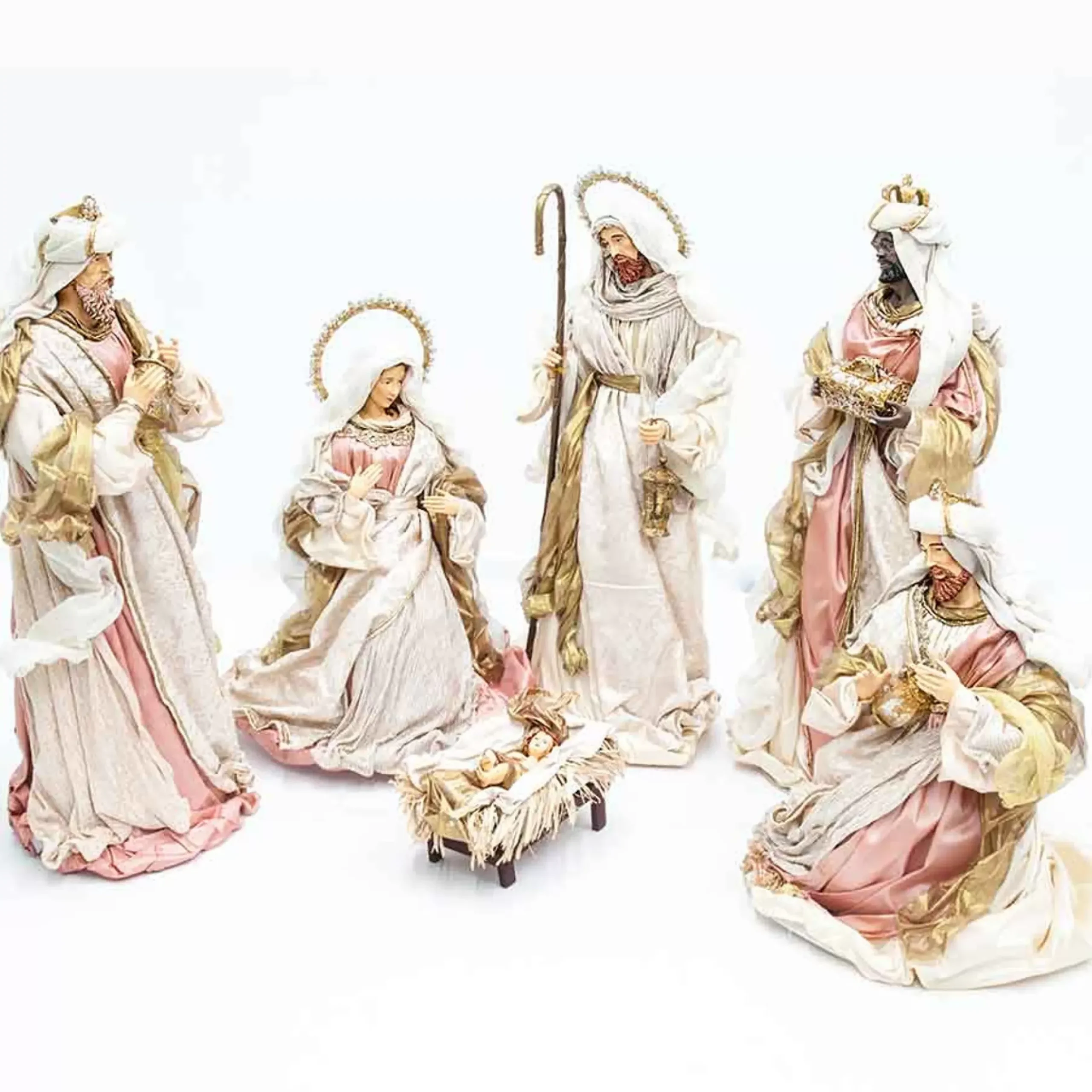 The Newborn King Is Admired By The Divine Holy Family. This Stunning Nativity Scene Features A 6 Piece Set Of Nativity Figures Wrapped In Pale Pink, Off White And Metallic Hues.This Set Will Look Perfect As A Centerpiece Display At Home Or Festive Area