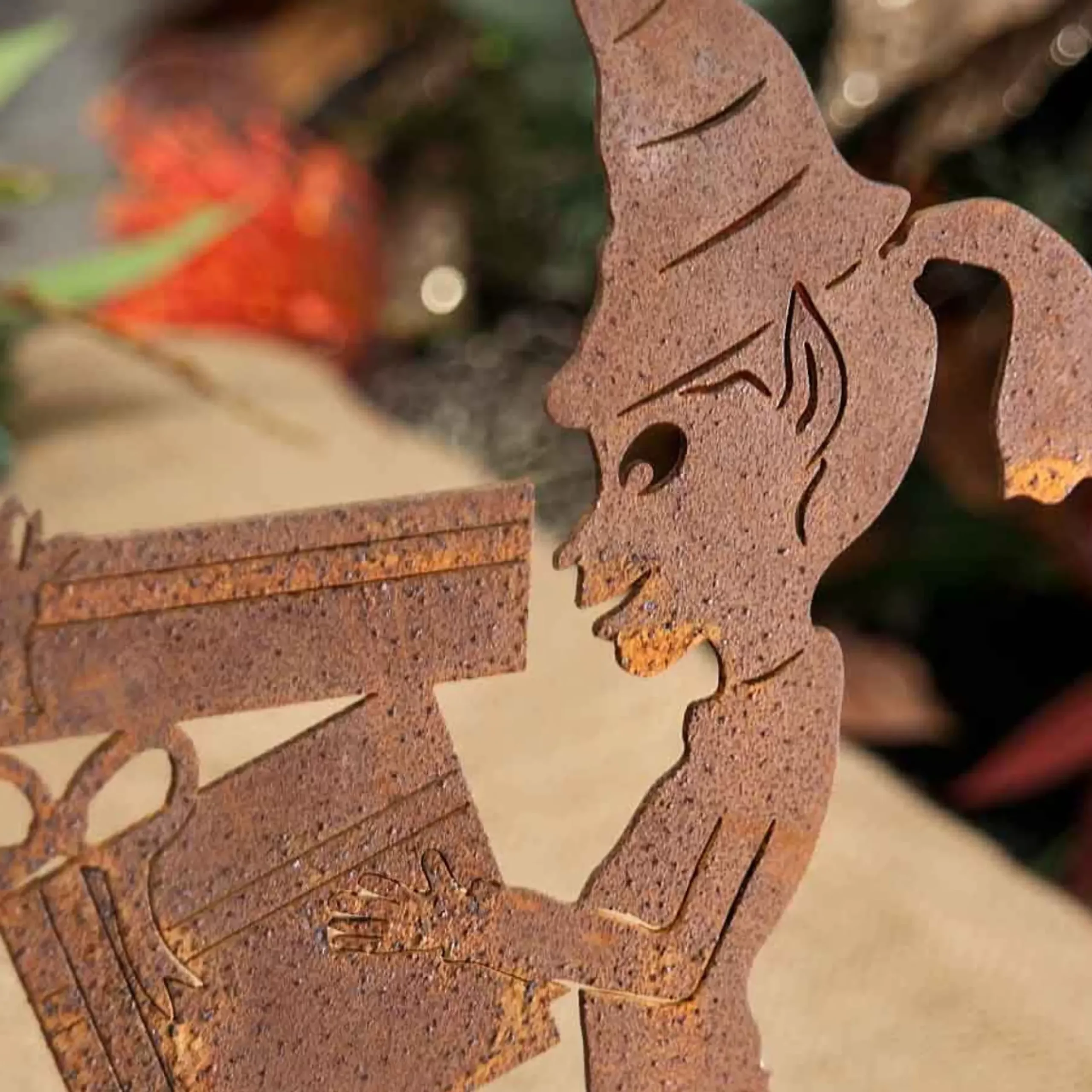 The Christmas Elf Girl Stand Garden Figurine Is Crafted From Mild Steel And Features A Rustic Patina That Is Entirely Natural. This Adorable Little Elf Has Been Showered With Gifts And Is Eager To Give Them Out. A Beautiful Outdoor Accent That Will Win The Hearts Of Everyone Who See It.
