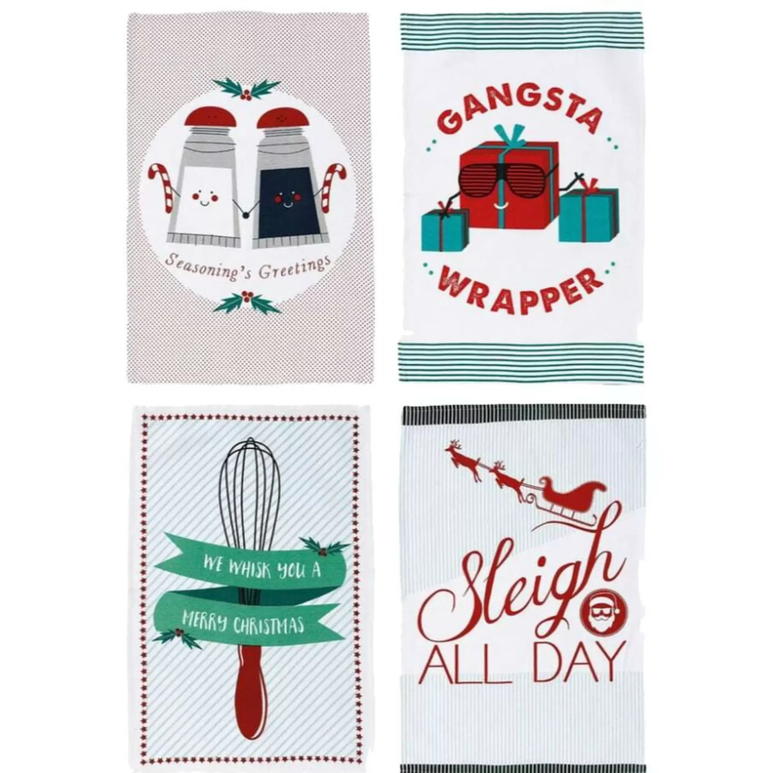 Available In 4 Designs – Season’s Greetings, Gangsta Wrapper, We Whisk You A Merry Christmas, Sleigh All Day