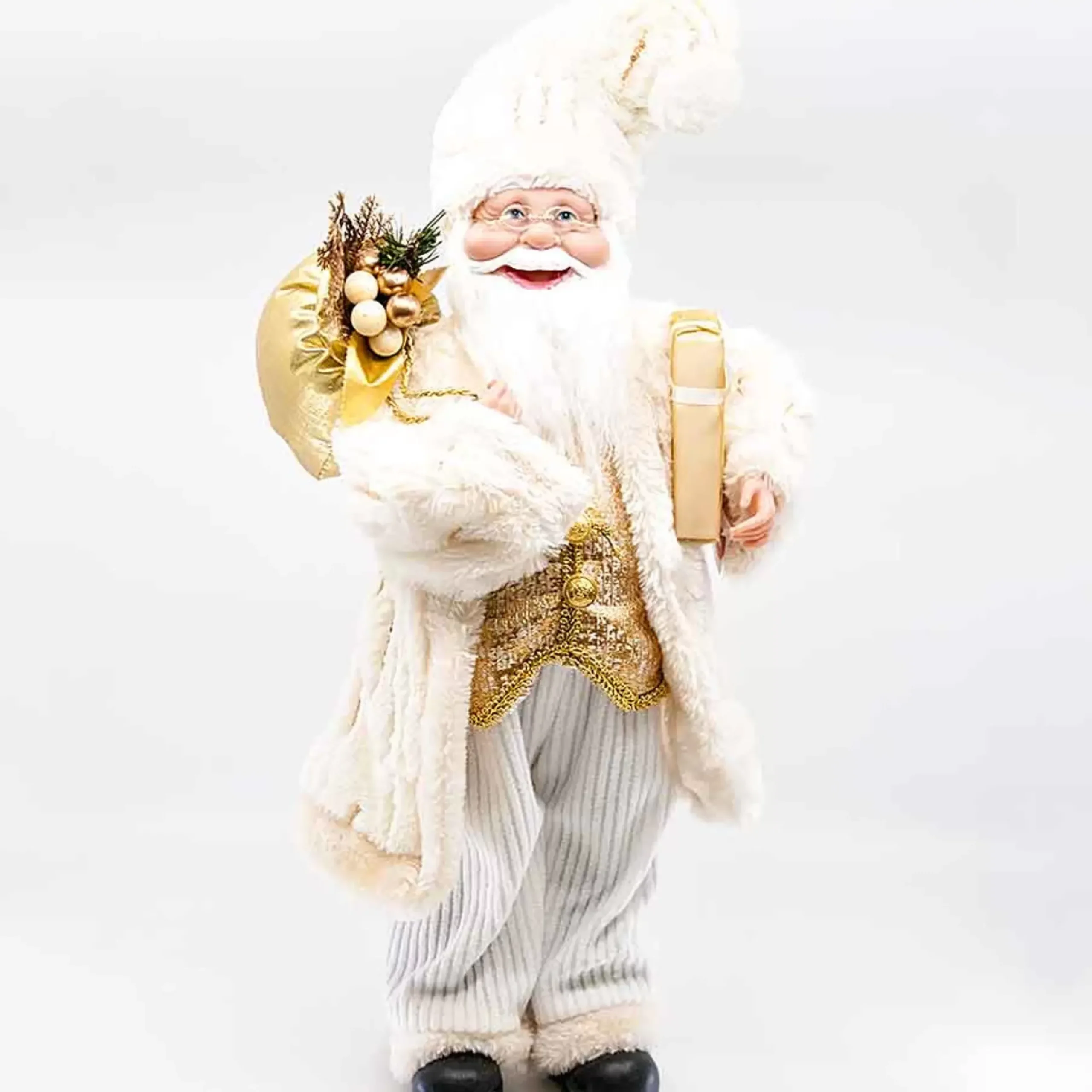 Celebrate The Festive Season With Santa Claus Dressed In A Gold And Ivory Plush Suit … Santa Holds Presents Over His Shoulder.