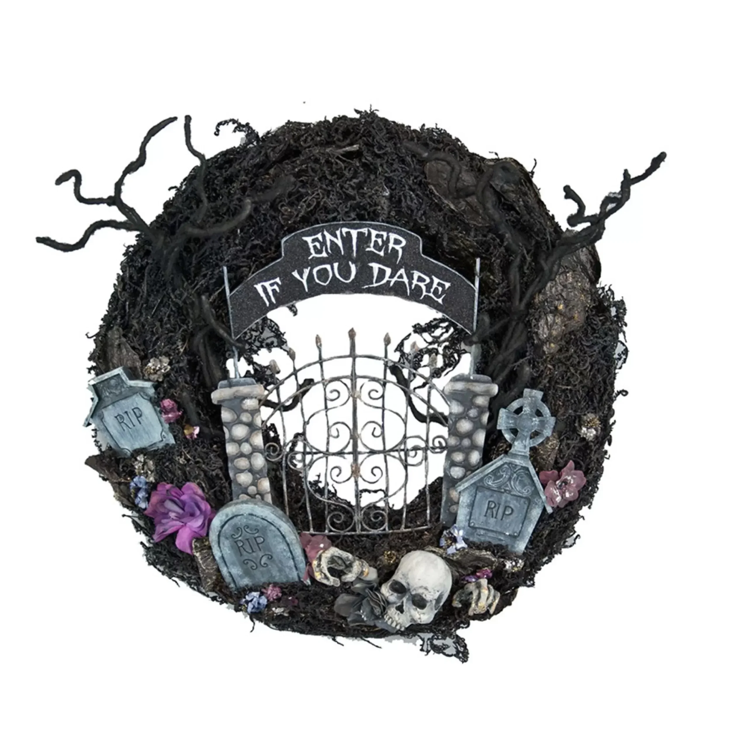 This Spooky Wreath Is Covered In Black Moss And Features The Silver Gates To The Haunted Cemetery And Several Haunted Tombstones… Oddly Elegant Considering!