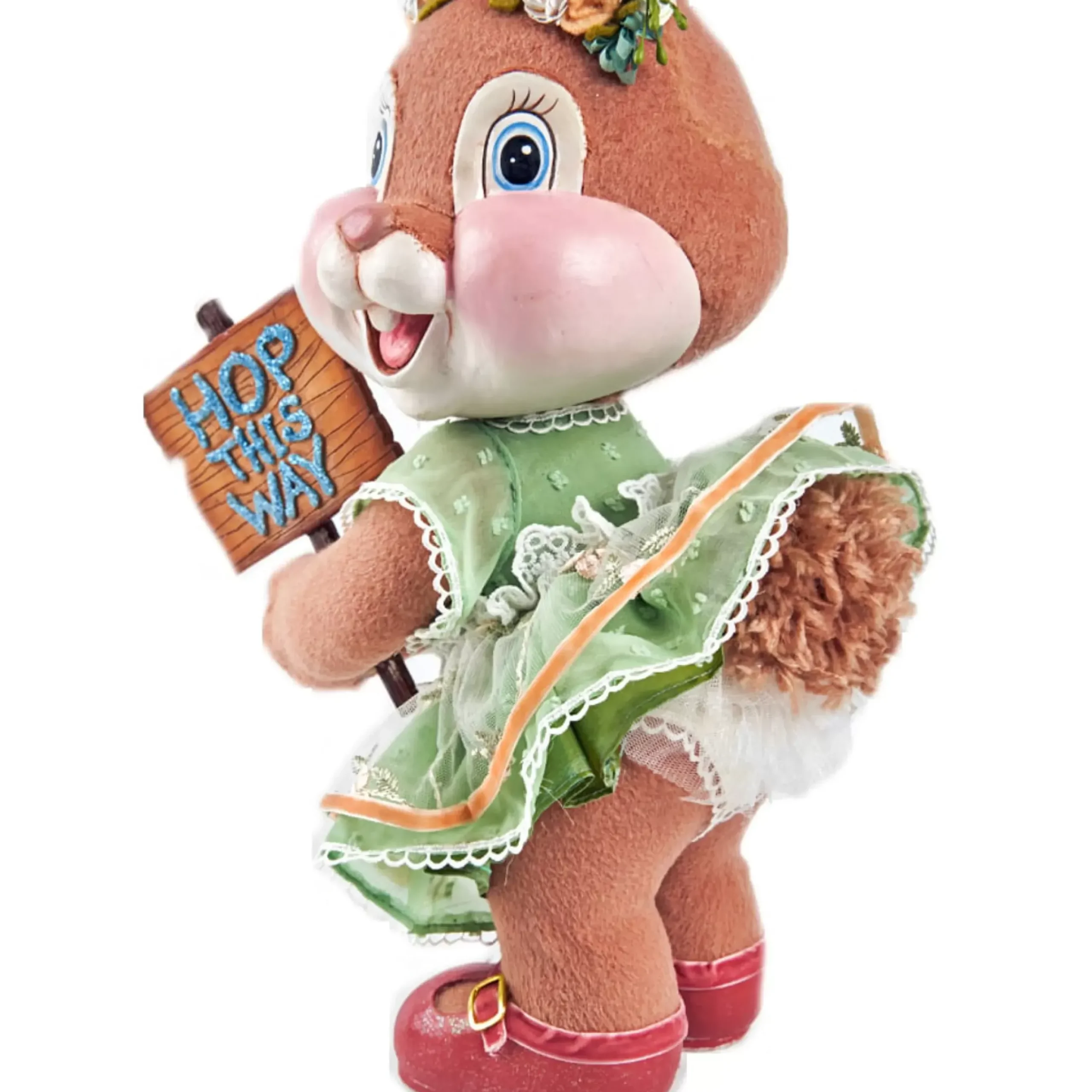 Welcome Your Guests With This Adorable Bunny Tabletop Figurine By Katherine’s Collection. She Is Wears A Green Dress With A Frill Organza Skirt, Trimmed With Contrast Scalloped Lace And Velvet Ribbon. She Wears Beautifully Detailed Flowers In Her Hair And Holds A “This Way” Sign. A Great Piece For Your Entrance!