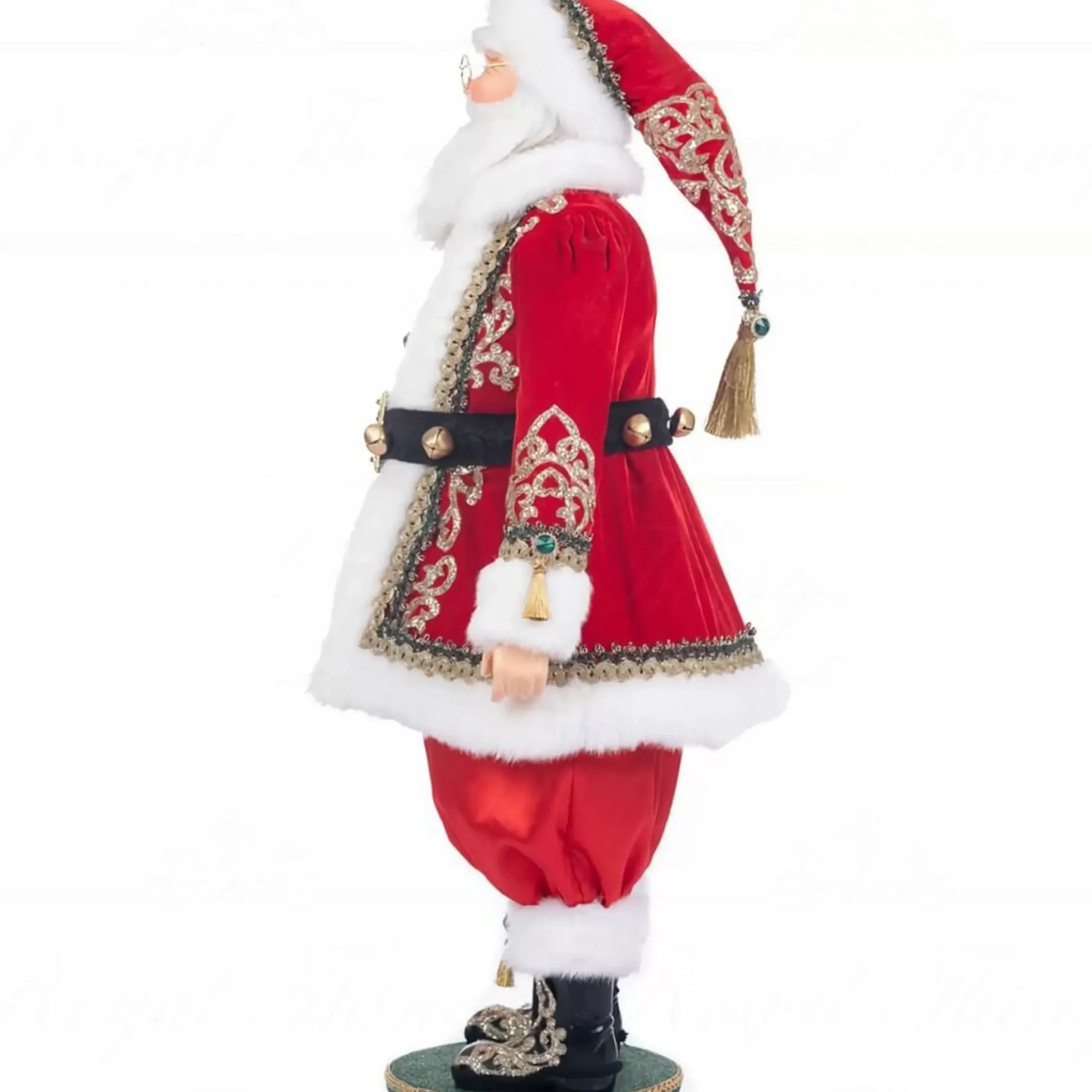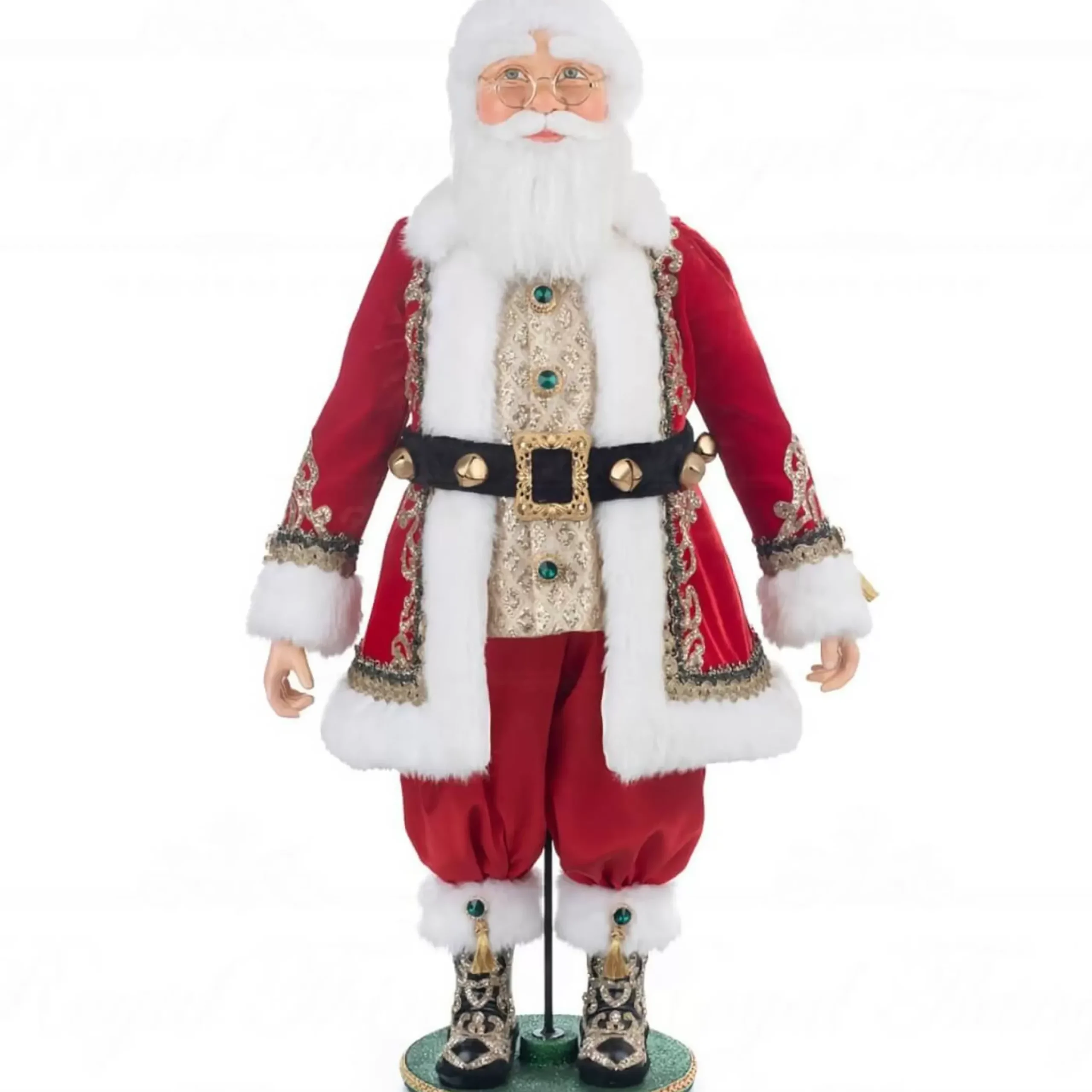 Santa Is Decked Out In His Finest Attire, Which Includes A Red Velvet Coat With White Fur Trim, A Black Belt With Gold Bells, And A Gorgeous Gold Brocade Blouse With Green Jewel Buttons. Along With His Black Boots That Have Gold Embroidery On Them, He Is Sporting A Pair Of Red Slacks.