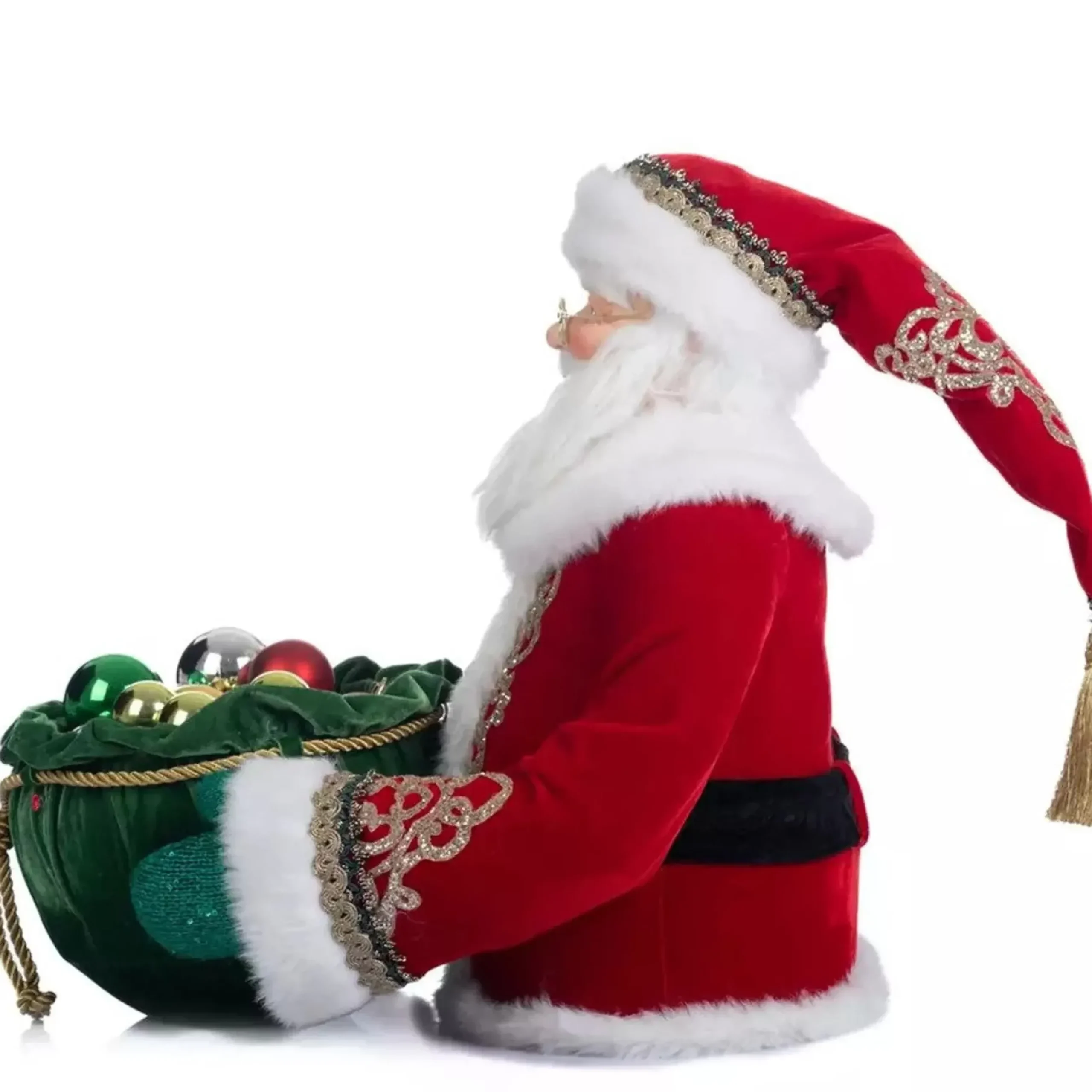 Santa Claus Is At Your Service To Help With The Christmas Party. He’s Wearing A Stunning Red Suit With White Fur Lapels And Gold Beaded Filigree. A Enormous Bowl Fashioned After A Green Toy Sack Decorated With Gold Rope And Red Diamonds Is Held In His Green Mittens. As A Christmas Party Favour, A Modest Gift, This Can Be Used To Store Candy Or Wrapped Cookies.