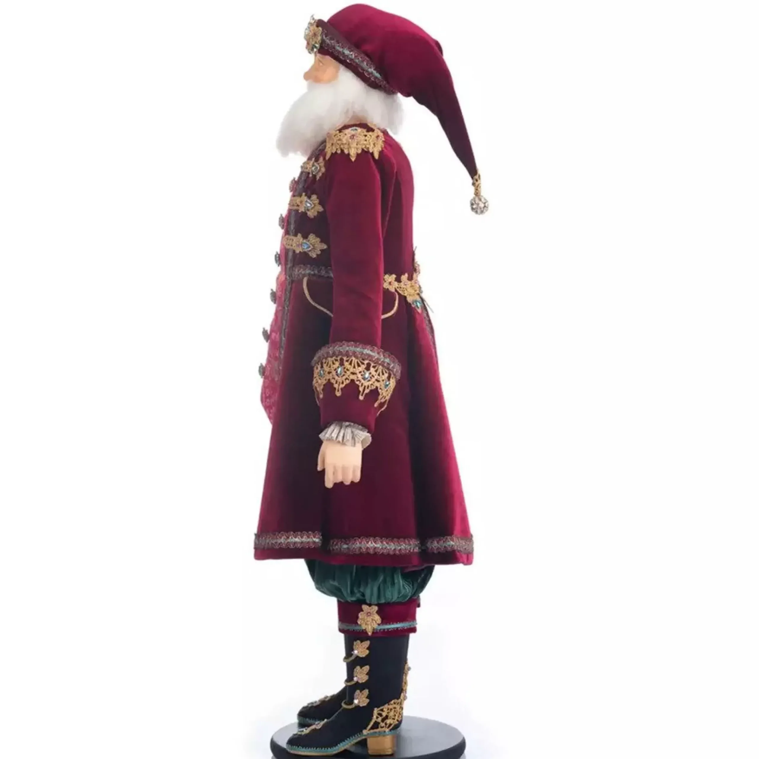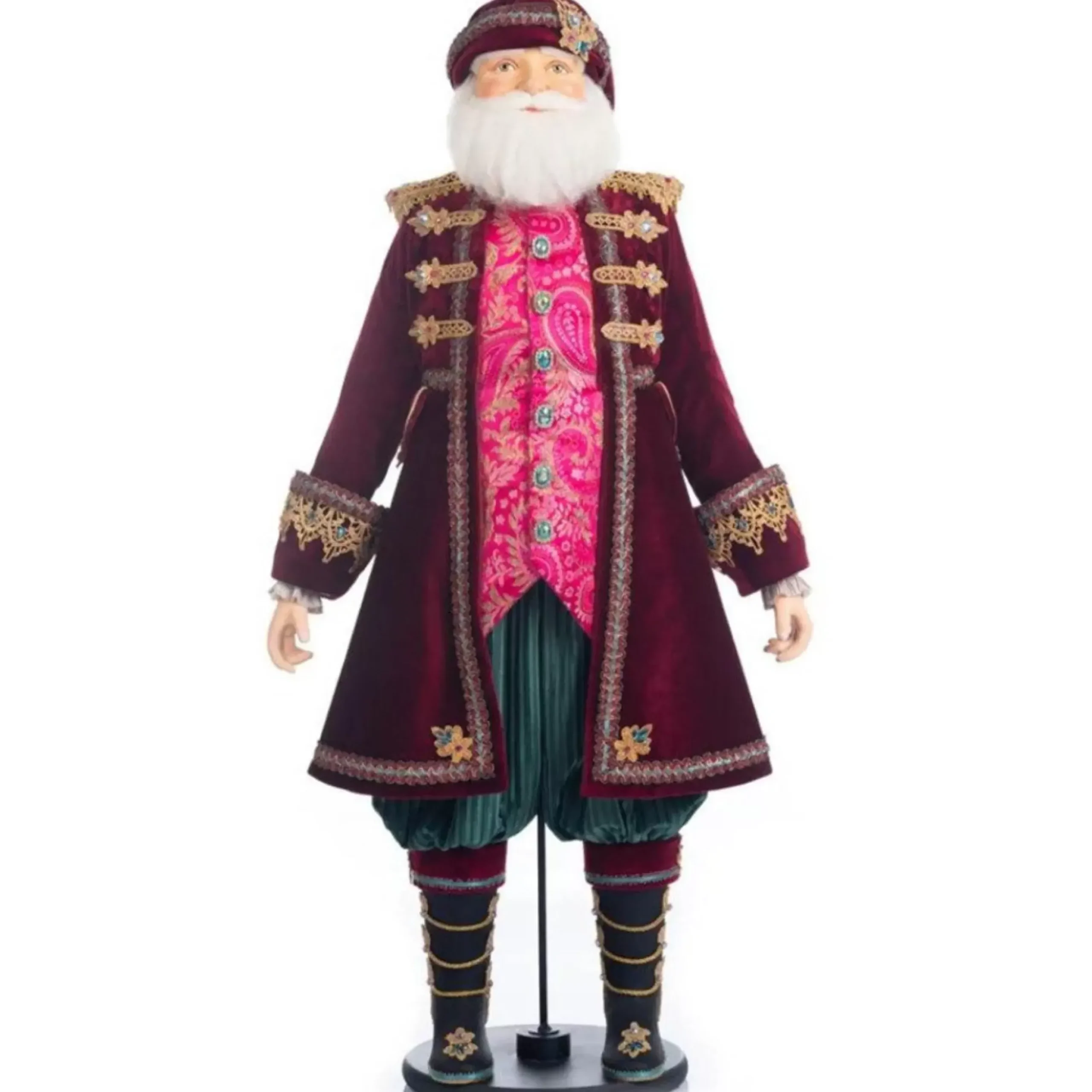 Santa Is Ready To Party This Holiday Season. He’s Decked Out In A Plum Velvet Jacket With Blue And Gold Embroidery. His Jacket Covers A Shirt With A Beautiful Paisley Pattern In Pink And Orange And Contrast Blue Jewel Buttons. His Has Emerald Green Ribbed Knickerbockers And Sleek Black Boots With Gold Rope Accents. This Is A Gorgeous Piece To Add To Your Festive Collection This Season