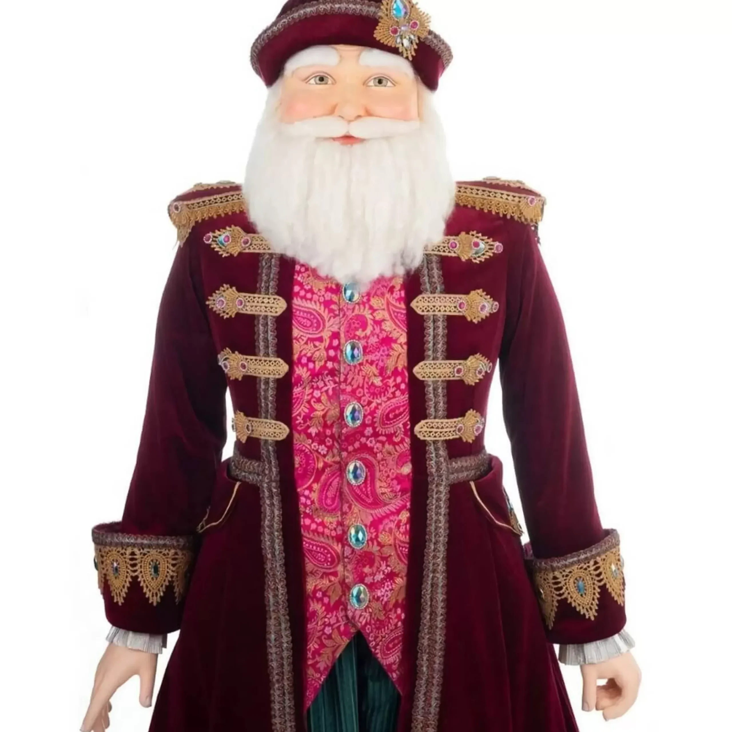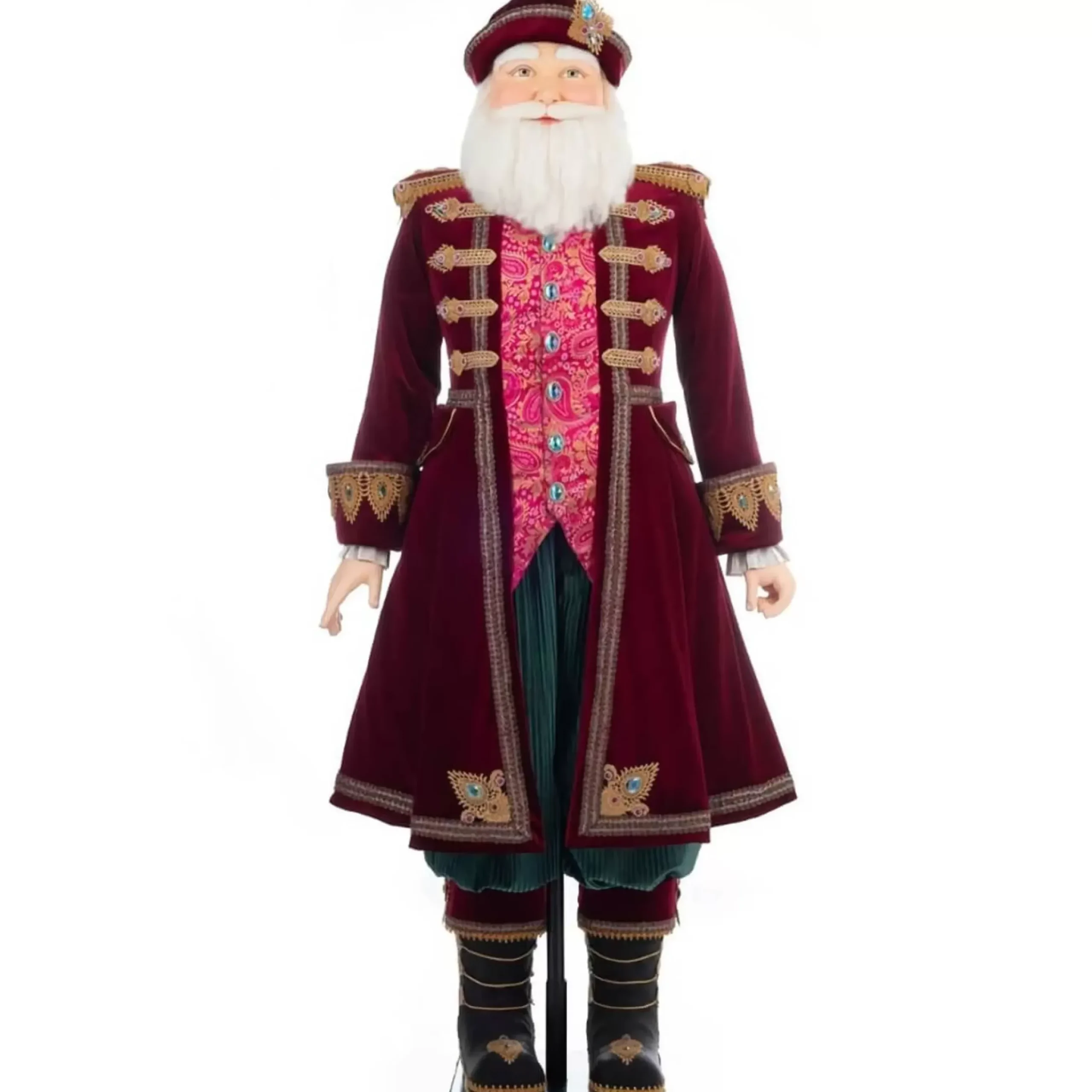 Santa Is Ready To Party This Holiday Season. He’s Decked Out In A Plum Velvet Jacket With Blue And Gold Embroidery. His Jacket Covers A Shirt With A Beautiful Vibrant Paisley Pattern In Pink And Orange And Contrast Blue Jewel Buttons. His Has Emerald Green Ribbed Knickerbockers And Sleek Black Boots With Gold Rope Accents. This Is A Gorgeous Piece To Add To Your Festive Collection This Season