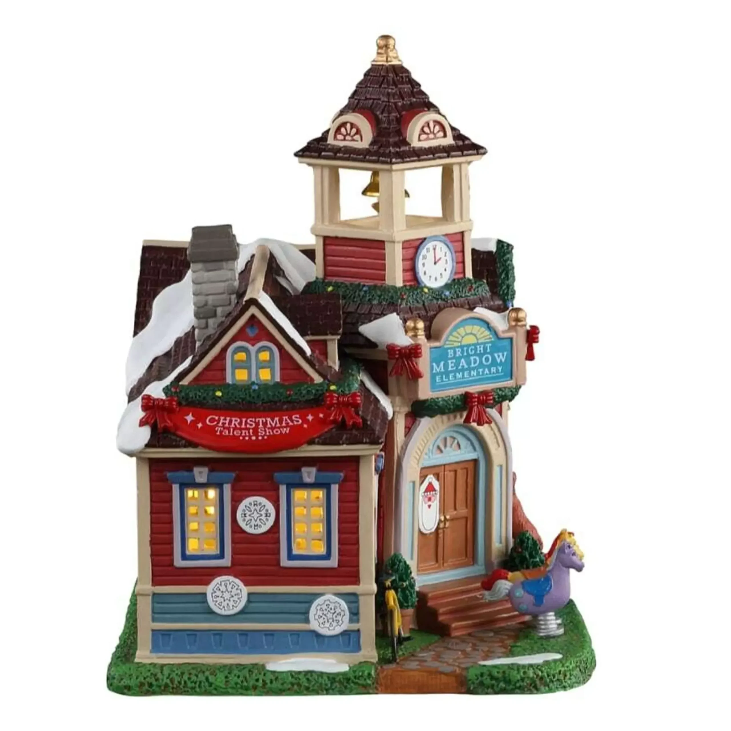 Bright Meadow Elementary Is Getting Ready For The Christmas Talent Show! This Colourful School Has A Bell Tower And A Clock Perched Above The Front Door. In The Front Yard, You Can See A Pair Of Playground Rocking Horses And A Dog Looking Through The Window. Inside The Window, You Can See All The Kids Practicing For Their Upcoming Performance In The Big Christmas Talent Show!