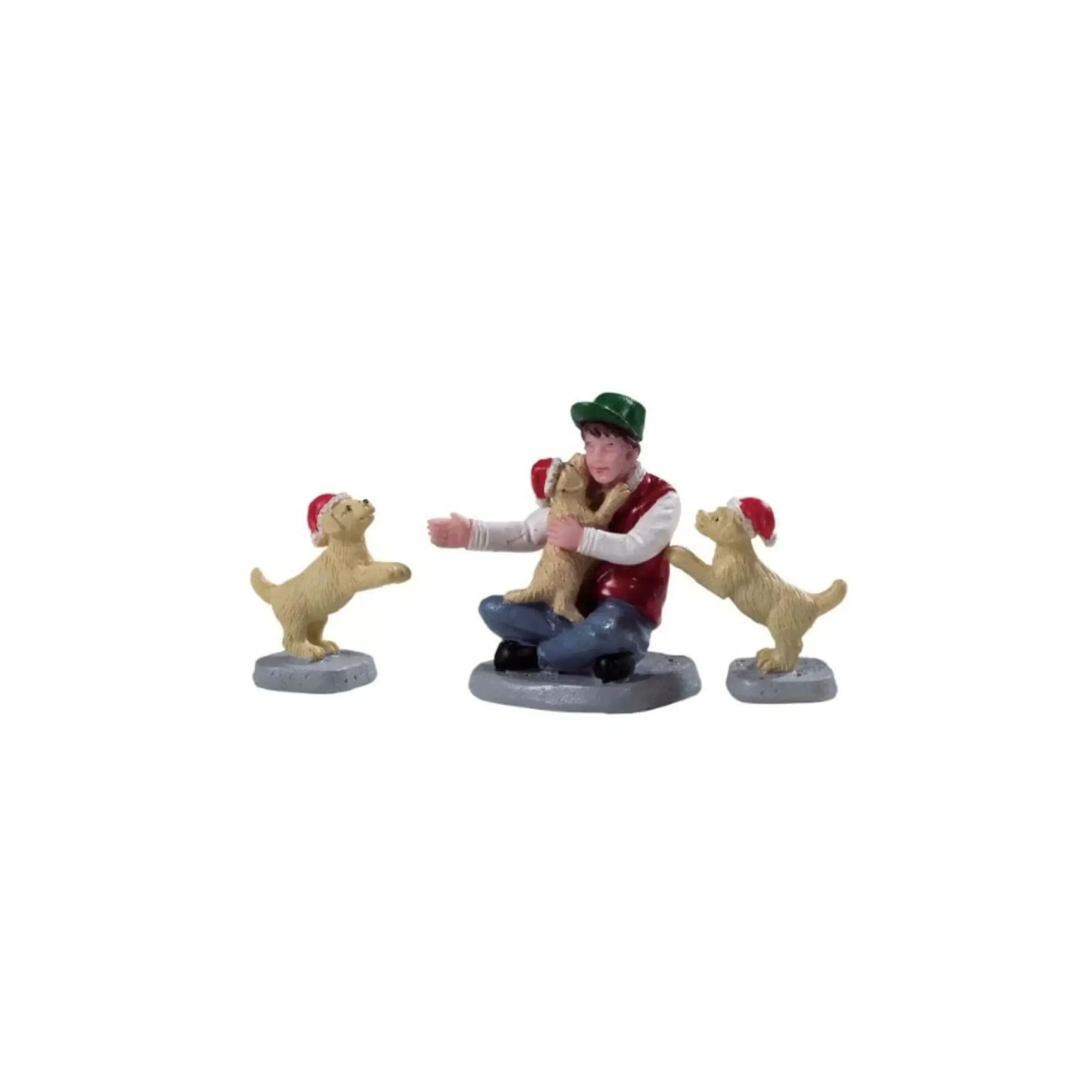 New Puppies Is A Christmas Village Figurine That Features A Familiar Christmas Scene. A Boy In A Green Hat And Red Jacket Is Sitting Cross-Legged On The Floor As He Receives The Best Christmas Surprise Imaginable: Three Newborn Puppies In Christmas Hats Jumping All Over Him.