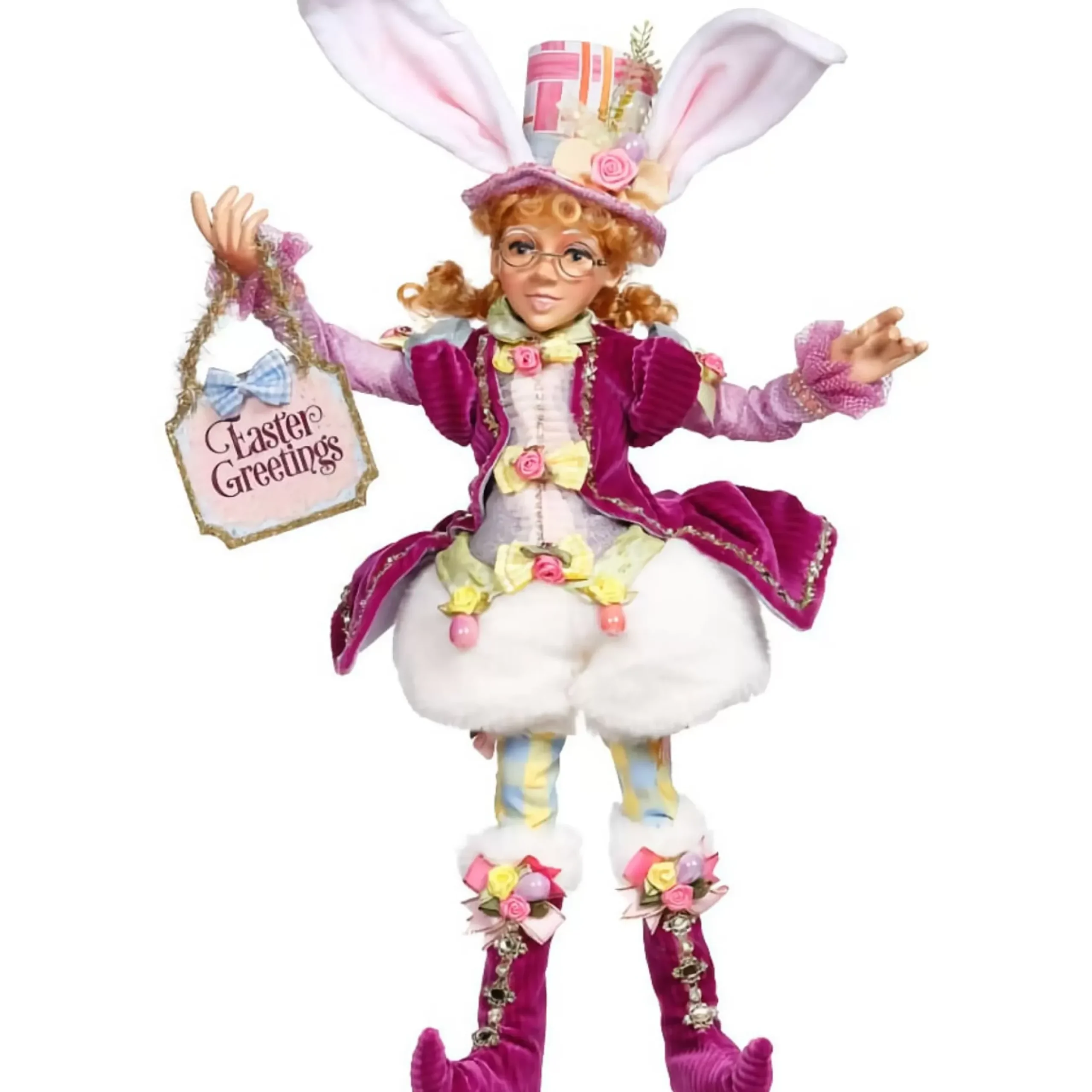 This Fabulous Festive Mark Roberts Easter Basket Fairy Is All Decked Out For The Celebration. In Her Wonderful Bunny Ear Trimmed Hat, Rich Velvet Overcoat, Pleated Blouse, Checked Leggings And Pink Boots. Featuring All Over Attention To Detail, Including 3D Flowers, Bows, Diamontes And Holding An Happy Easter Egg Sign. She Will Be The Best Display For Your Guests