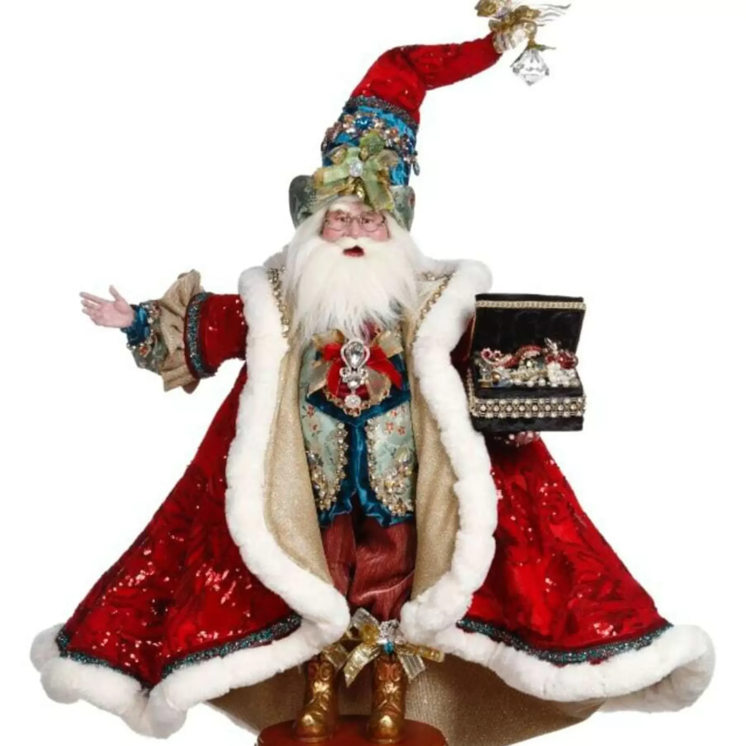 Dress Your Home This Christmas Season With Mark Roberts Collectable Santa Who Holds A Chest Box Full Of Wonderful Gems. He Wears His Stunning Red Velvet Coat With Beautiful Sequin Detail, Trimmed With Faux Fur. His Vest, Sleeve And Hat Embellished With Crystal Jewels And Bows. A Great Piece To Add To Your Mantle, Table Top Or Amongst Your Decor.