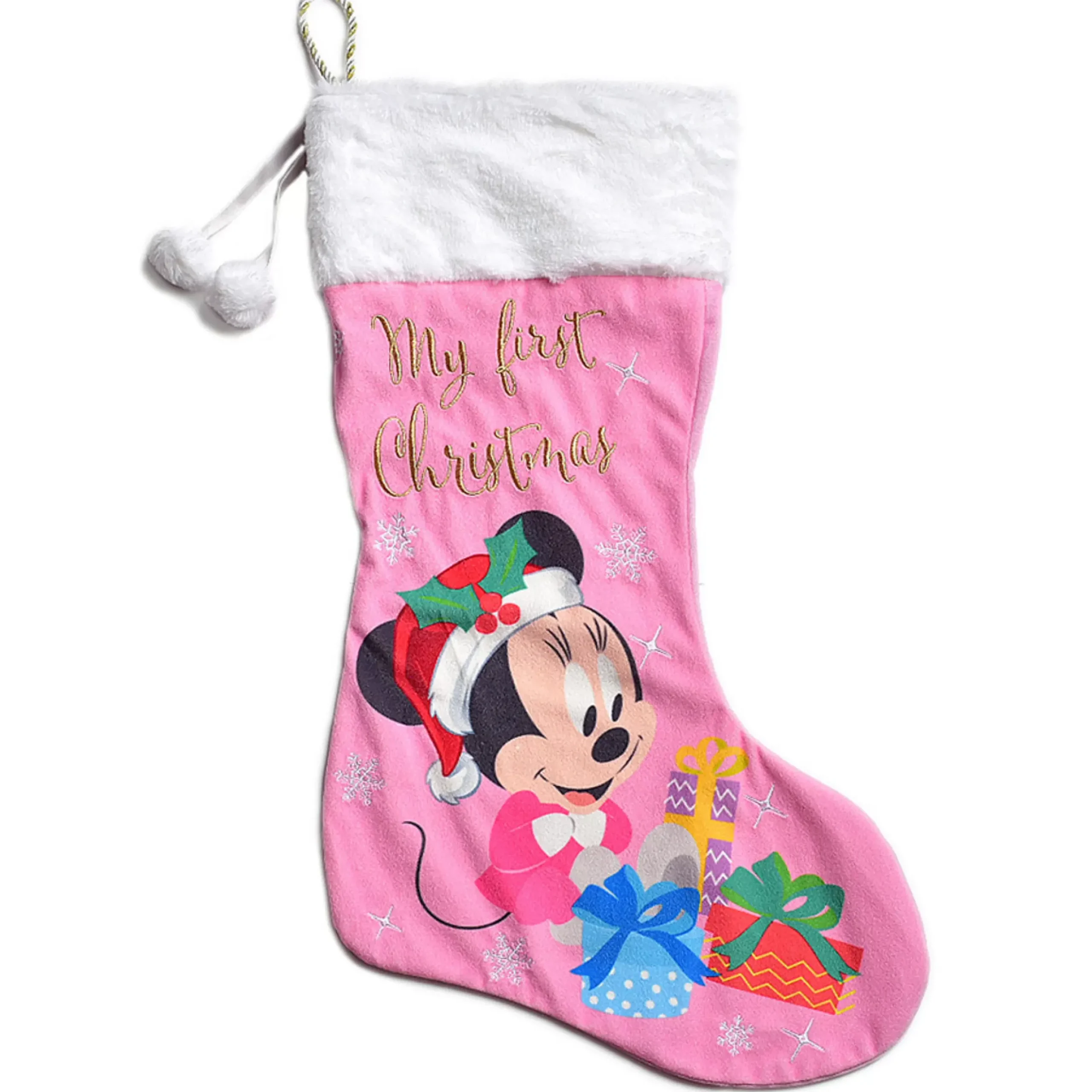 Bring The Magic Of Disney Home This Festive Season! This Pink Christmas Stocking Features Minnie Mouse Sitting In Excitement, Waiting To Open Her Presents. A Contrast Faux Fur Cuff And Pom Pom. Ideal For Adorning The Mantel Or Staircase.