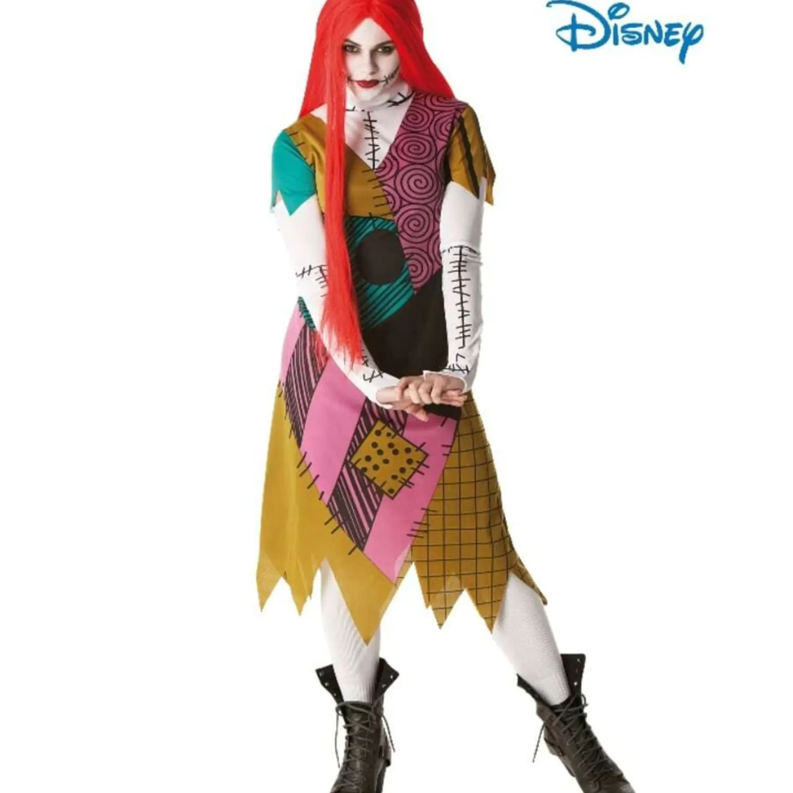 Sally Is A Humanoid Rag Doll, Created By Dr Finkelstein In Disney’s 1993 American Dark Fantasy Halloween-Christmas Movie Called The Nightmare Before Christmas, Produced By Tim Burton. She Is Made Of Various Pieces Stitched Together, With Dead Leaves As Stuffing. Sally Is Always Under The Doctor’s Lock And Key, So To Escape, She Poisons The Doctor And Sneaks Out. Sally Wears A Rag Doll SHift Style Dress. Digitally Printed With Stitching Patterns, Featuring Rough Raw Edging To Sleeves And Hem. Long Red Wig And GLovelets. Shoes And Stockings Not IncludedThis Is An Officially Licensed Nightmare Before Christmas Product