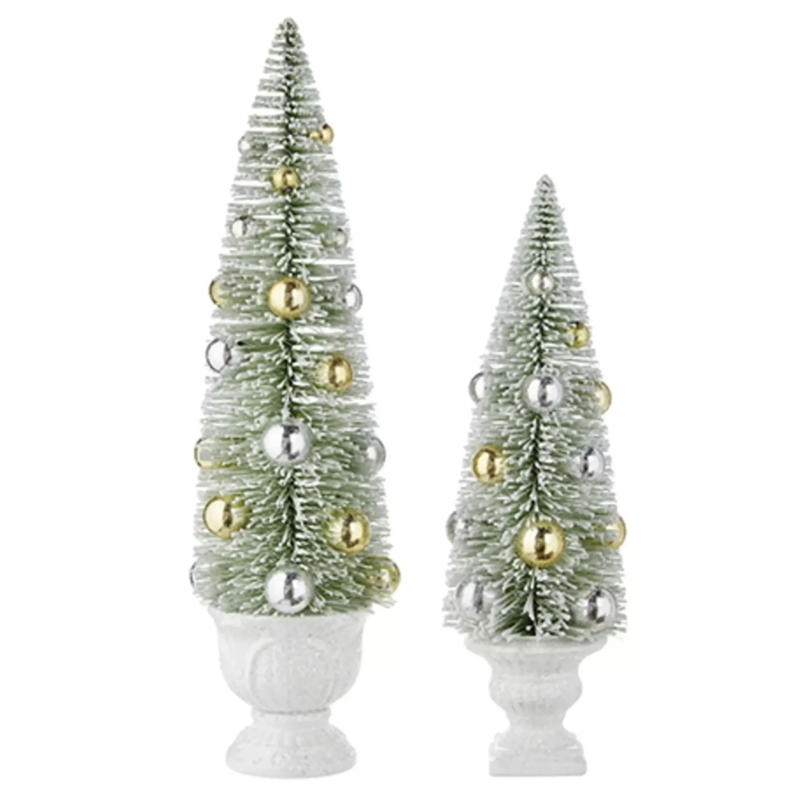 Snowy Green Bottle Brush Trees With Baubles (Set Of 2)