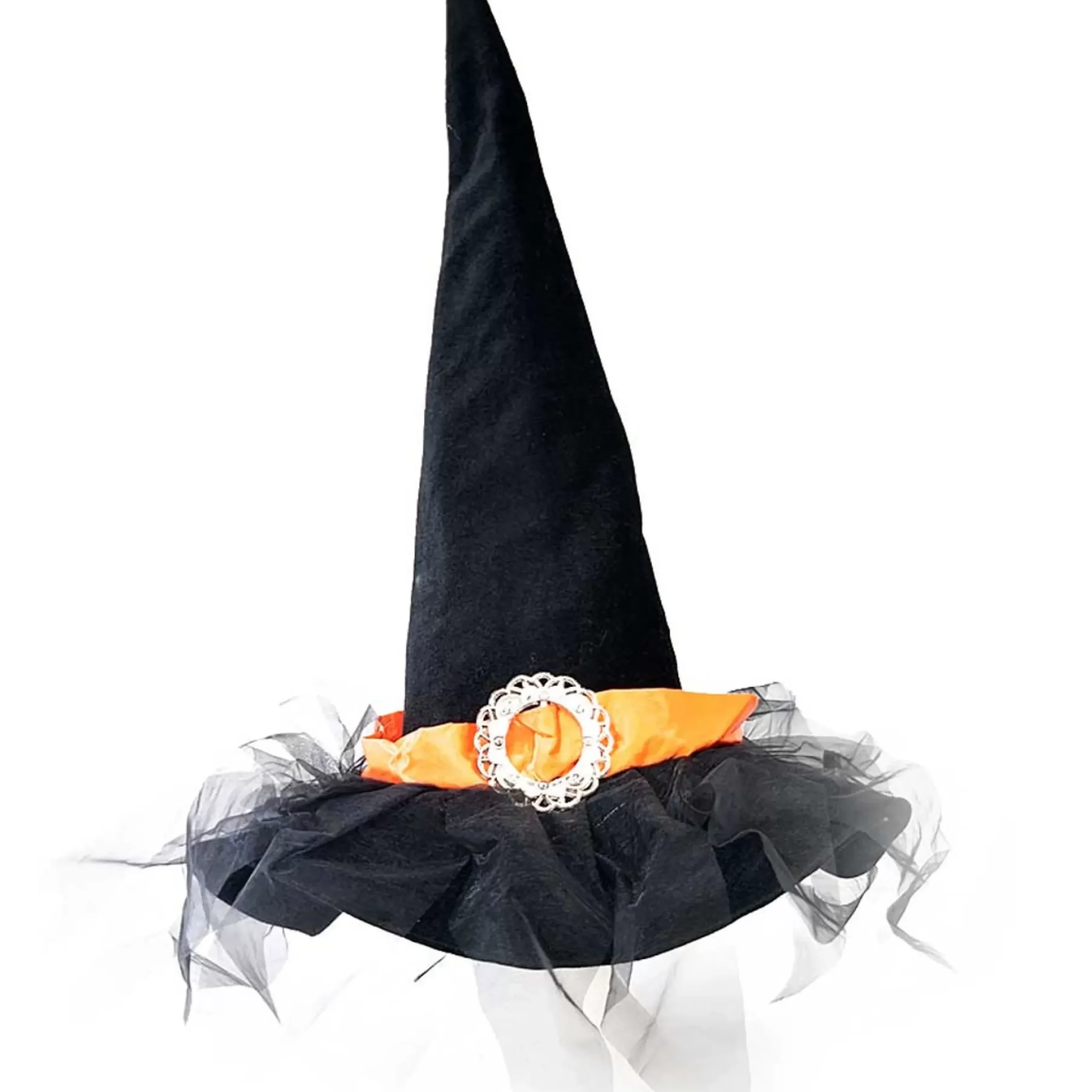Ensure To Complete Your Halloween Outfit With This Long Black Hat. Featuring Soft Tulle At The Base, Contrast Orange Sash And Silver Buckle With Diamonte Detail